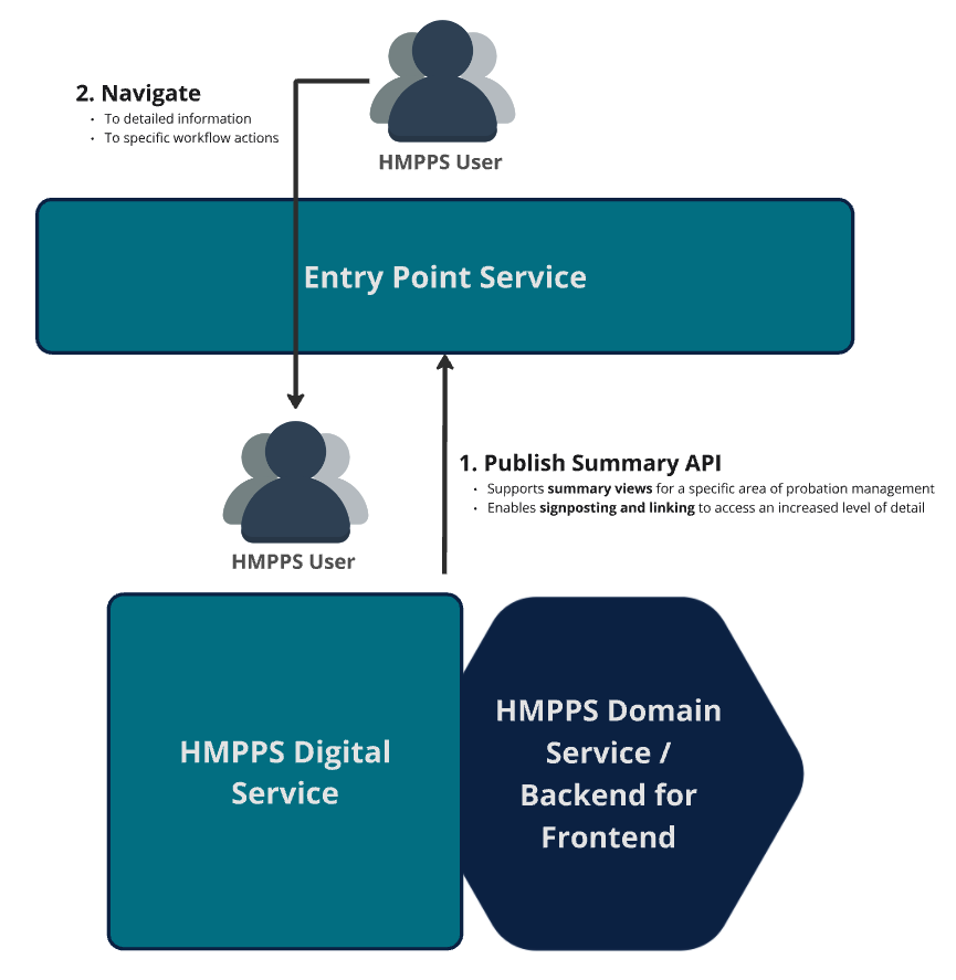 Entry point services collate information from many sources and provide summary views and links to more detailed information and workflows. By supporting these actions the service provides an entry point with the ability to understand the availability of relevant information, and provides the source data to display a summary and link where needed. Without a summary API the entry point service may need to use many API calls to gather the information needed